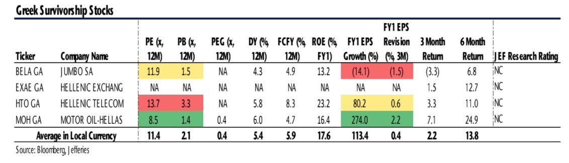 Ο βασικός δείκτης της αγοράς μετοχών διαπραγματεύεται με 12,7 φορές δείκτη κερδών (forward P/E) 0,97 φορές δείκτης τιμής προς εσωτερική αξία (forward P/BV) και 3,2% μερισματική απόδοση. Οι ελληνικές μετοχές που καλύπτονται από την Jefferies είναι η Coca Cola HBC και εισηγμένες της ποντοπόρου ναυτιλίας σε χρηματιστήρια του εξωτερικού και έχουν συστάσεις αγοράς (buy) όπως η Tsakos Energy, Stealthgas, Starbulk, Gaslog Partners, Danos και Capital Product.