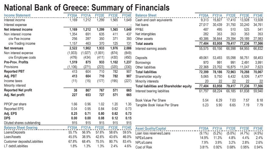 «Για το 2024, ο δείκτης αποδοτικότητας ROTE αυξάνεται σε 9,7% από 8,2% προηγουμένως. Οι μετοχές έχουν δει μια ισχυρή απόδοση μαζί με άλλες ελληνικές τράπεζες, με άνοδο 27% φέτος έναντι του δείκτη των ευρωπαϊκών τραπεζών με άνοδο 17%. Ο τίτλος διαπραγματεύεται με 0,65 φορές την ενσώματη λογιστική αξία (TBV) και 6,5 φορές σε όρους P/E.