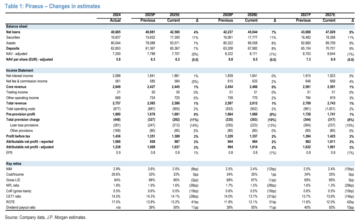“Με δείκτη P/E σε 6,1x το 2026 και δείκτη P/TBV σε 0,7x παραμένουμε άνετοι με τη μακροχρόνια αξιολόγηση overweight για τις μετοχές της Πειραιώς. Πιθανή ροή ειδήσεων σχετικά με το ενδιαφέρον της Πειραιώς για την Εθνική Ασφαλιστική είναι κλειδί για να παρακολουθήσουμε’, επισημαίνει η JP Morgan.