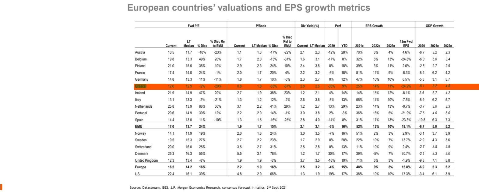 Ο δείκτης MSCI Italy είναι με μικρή διαφορά η δεύτερη πιο ελκυστική αγορά με δείκτη forward P/E στις 13,1 φορές ενώ η μερισματική απόδοση του δείκτη MSCI Greece για το διάστημα των επόμενων 12 μηνών είναι πολύ υψηλότερη, στο 2,8% έναντι 2,1% για τις ευρωπαϊκές μετοχές. Η JP Morgan, βάσει και των εκτιμήσεων της IBES, προβλέπει ότι στην Ελλάδα ο ρυθμός ανάπτυξης των κερδών του 2021 θα κινηθεί στο +25%, +14% το 2022 και +11% το 2023.