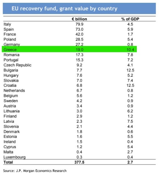Η αμερικανική τράπεζα προβλέπει ότι το ΑΕΠ της Ελλάδας θα αυξηθεί κατά 5,2% φέτος και 4,6% το 2022, σε παρόμοια επίπεδα με το μέσο όρο της Ευρώπης. Από την Ευρωζώνη, η JP Morgan εκτιμά ότι η περιφέρεια είναι ενδιαφέρουσα και οι περιφερειακές χώρες είναι οι μεγάλοι ωφελημένοι από το Ευρωπαϊκό Ταμείο Ανάκαμψης, εξηγώντας ότι τα κεφάλαια του σχεδίου αντιστοιχούν στο 9,4% του ΑΕΠ για την Ελλάδα είναι στο 10,4% και στα 19 δισ. ευρώ, το τρίτο υψηλότερο ως ποσοστό μετά την Κροατία και Βουλγαρία.