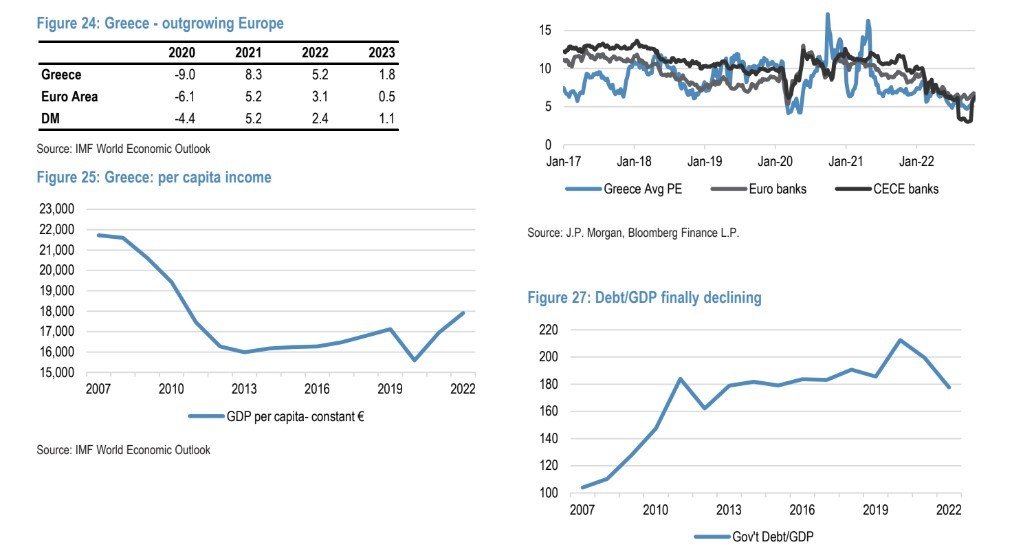 Η Ελλάδα φαίνεται να έχει λιγότερες επιπτώσεις από τις αντίστοιχες χώρες της ΕΕ από τις υψηλές τιμές του φυσικού αερίου και οι προοπτικές ανάπτυξης για το επόμενο έτος φαίνονται σταθερές, καθώς τα κεφάλαια της ΕΕ θα παίξουν το ρόλο τους, εξηγεί η JP Morgan. Η εξυγίανση των τραπεζών έχει σε μεγάλο βαθμό ολοκληρωθεί, οι θέσεις των ξένων επενδυτικών κεφαλαίων είναι ακόμη μικρές αλλά η μακροπρόθεσμη ανάπτυξη αποτελεί πρόβλημα και η το μέγεθος της αγοράς είναι μικρό, εξηγεί η JPM. Oι ισολογισμοί των τραπεζών έχουν καθαρίσει με επιτυχία και το μακροοικονομικό σκηνικό είναι θετικό και πιο ανθεκτικό στην ευρωπαϊκή ύφεση από ό,τι το μεγαλύτερο μέρος των χωρών Tσεχίας, Πολωνίας και Ουγγαρίας (CE3).