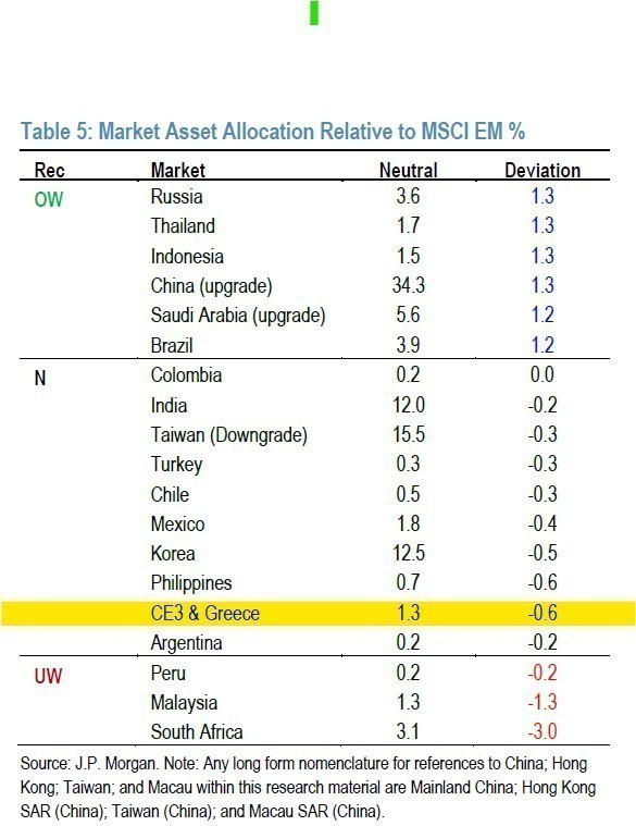 Στις «ελκυστικές» ευρωπαϊκές αγορές μεταξύ των αναδυόμενων τοποθετεί τη χώρα μας ο αμερικανικός επενδυτικός οίκος JP Morgan και σύσταση «ουδέτερη». Στις overweight αγορές τοποθετεί τις χώρες Ρωσία, Ταϊλανδή, Ινδονησία, Κίνα, Σαουδική Αραβία και Βραζιλία. Στα θετικά για τη χώρα μας αναφέρονται η ισχυρή ανάκαμψη της οικονομίας, ενώ στα αρνητικά στοιχεία το χαμηλό ποσοστό εμβολιασμού το οποίο προκαλεί κινδύνους, όπως εξηγεί η JPM.