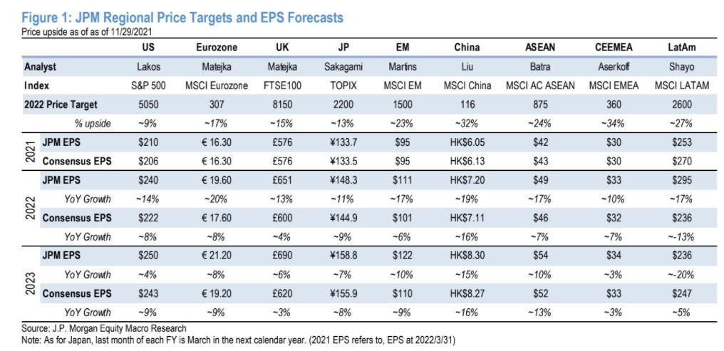 5. Ενώ οι πολλαπλασιαστές των μετοχών έχουν ανατιμηθεί σε απόλυτους όρους σε σχέση με την προ-COVID περίοδο, η σχετική αξία των μετοχών έναντι του σταθερού εισοδήματος εξακολουθεί να είναι σαφής. Η αύξηση των κερδών ήταν ιδιαίτερα υψηλή φέτος, με τα EPS της Ευρωζώνης να αυξάνονται κατά 65% και του Ηνωμένου Βασιλείου κατά 86%, από μια υποτονική βάση. Η JPM εκτιμά ένα ακόμη έτος θετικών εκπλήξεων στα κέρδη, σε σχέση με τις τρέχουσες εκτιμήσεις των αναλυτών.