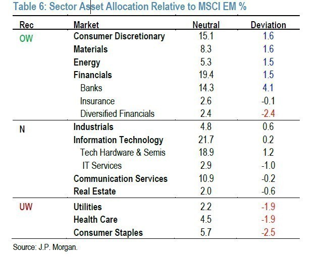 Η JPM διατηρεί την κατανομή υπέρ του κινδύνου στις μετοχές στις αναδυόμενες χώρες (ΕΜ) και εστιάζει σε ευνοϊκούς παράγοντες: πάνω από την τάση ανάπτυξη του παγκόσμιου ΑΕΠ, πραγματικά επιτόκια κοντά στο μηδέν, εμβολιασμός και επαναλειτουργία (ορίζοντας σχεδιασμού νοικοκυριών για τις δαπάνες και των επιχειρήσεων για τις επενδύσεις), υψηλότερο από το ιστορικό ασφάλιστρο κινδύνου (ERP) για τις ΕΜ σε σχέση με τις ανεπτυγμένες αγορές (ΑΑ).