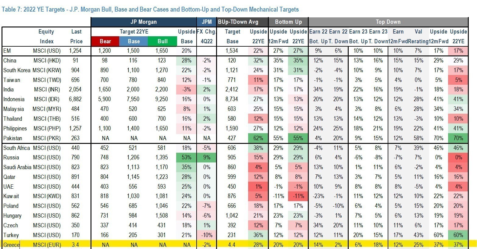 Η JP Morgan στην ετήσια στρατηγική της για τις αναδυόμενες αγορές θέτει την Ελλάδα ως μια από τις ελκυστικές αγορές της Κεντρικής και Ανατολικής Ευρώπης, Μέσης Ανατολής και Αφρικής (CEEMEA) και θέτει συστήνει ουδέτερη σύσταση για τους ελληνικούς τίτλους. Ως τους πιο ελκυστικούς τομείς από την περιοχή CEEMEA είναι η Νότια Αφρική, το Κουβέιτ, η Τουρκία, το Πακιστάν, η Αίγυπτος, η Ελλάδα, η Ουγγαρία και η Πολωνία. Ως τους πιο ελκυστικούς τομείς από τη Νότια Ασία: Κίνα (OW) και Νότια Κορέα, Μαλαισία, Φιλιππίνες και Ινδονησία (OW). Ταυτόχρονα εκτιμά ότι Ελλάδα, Ρωσία, Ινδία, Μεξικό, Περού, Φιλιππίνες και η Ν. Αφρική ανήκουν στο στην κατηγορία των χωρών με υψηλή αύξηση του ΑΕΠ σε σχέση με το δυνητικό, αλλά με χαμηλότερη βαθμολογία στην ανοσοποίηση του πληθυσμού έναντι της Covid-19, γεγονός που συνεπάγεται κίνδυνο για την ανάπτυξη από παρατεταμένους περιορισμούς.