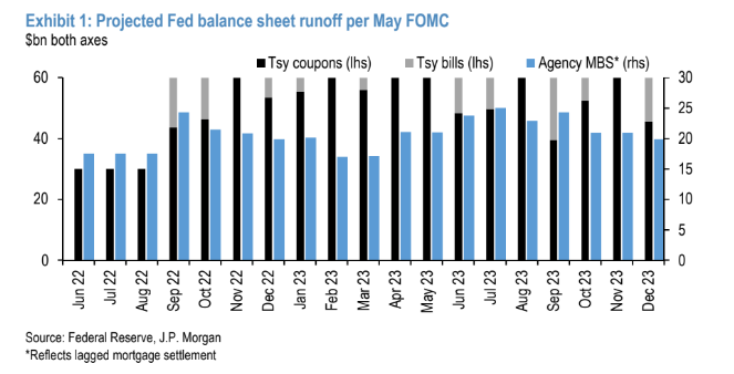 «Από αυτή την εβδομάδα, η Fed θα αρχίσει πραγματικά την ποσοτική σύσφιξη (QT) και θα μειώσει τις επανεπενδύσεις από τα κουπόνια των ομολόγων και τους λοιπούς τίτλους που κατέχει, υπό την επιφύλαξη των αρχικών μηνιαίων ανώτατων ορίων των 30 δισ. δολαρίων και 17,5 δισ. δολαρίων για τα ομόλογα του Δημοσίου, εξηγεί η JP Morgan.