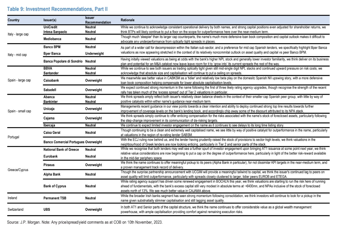 «Εντός των τραπεζών, μετατοπίζουμε ανοδικά τις προτιμήσεις μας όσον αφορά την πιστωτική ποιότητα, μετακινώντας την υπερεπενδεδυμένη θέση μας στα ομόλογα Additional Tier 1 (AT1) σε ουδέτερη. Ταυτόχρονα, γινόμαστε πιο εποικοδομητικοί όσον αφορά τα ομόλογα της κατηγορίας Tier 2, ιδίως στα επαναγοράσιμα, προτείνοντας μια υπερεπενδεδυμένη στάθμιση εντός των ομολόγων μειωμένης εξασφάλισης. Εντός των Senior, αλλάζουμε τις συστάσεις μας από τον Ιούλιο, μεταβαίνοντας σε οverweight για τα Senior Preferred και υποχωρούμε σε ουδέτερη σύσταση σύσταση για τα ομόλογα Bail-In Senior», εξηγεί η τράπεζα.
