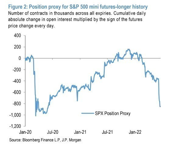 Παράλληλα, οι θέσεις των επενδυτών στα συμβόλαια μελλοντικής εκπλήρωσης του δείκτη S&P 500 είδαν μια ασυνήθιστα απότομη πτώση την περασμένη εβδομάδα και το επίπεδό τους πλησίασε το προηγούμενο χαμηλό που είχε παρατηρηθεί επίσης στο αποκορύφωμα της πανδημικής κρίσης τον Μάρτιο του 2020.