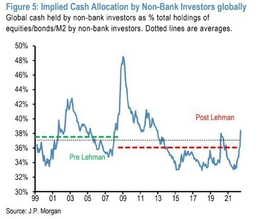 Αυτό που είναι πιο εντυπωσιακό για τους real investors δεν είναι τα χαμηλά beta των μετοχών τους, αλλά οι υψηλές θέσεις μετρητών στις κατανομές των χαρτοφυλακίων τους, σύμφωνα με την JPM. O δείκτης που παρακολουθεί η αμερικανική τράπεζα για την κατανομή μετρητών των επενδυτών σε παγκόσμιο επίπεδο αυξήθηκε απότομα τις τελευταίες εβδομάδες, ξεπερνώντας το προηγούμενο ανώτατο επίπεδό του που σημειώθηκε τον Μάρτιο του 2020, στο αποκορύφωμα της κρίσης της πανδημίας. «Με άλλα λόγια, ενώ υπήρξε κάποια μείωση στα μετρητά, τελικά βρίσκονται στο υψηλότερο επίπεδό τους από το 2012, δεδομένης της ταυτόχρονης συρρίκνωσης της αξίας των μετοχών και των ομολόγων από τις αρχές τους έτους», εξηγεί η τράπεζα.