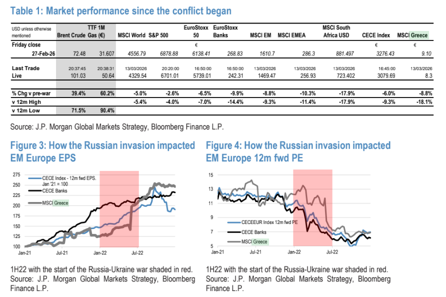 Ενδεικτική είναι και η απόφαση της JP Morgan να αφαιρέσει την Τράπεζα Πειραιώς από το Top 10 της περιοχής, παρά το discount έναντι των ευρωπαϊκών τραπεζών, επισημαίνοντας ότι το risk-reward προφίλ έχει επιδεινωθεί βραχυπρόθεσμα. Η ανάλυση υπογραμμίζει ότι η πορεία των ελληνικών μετοχών εξαρτάται πλέον σε μεγάλο βαθμό από εξωγενείς παράγοντες, όπως η ενίσχυση του δολαρίου, η εξέλιξη των τιμών ενέργειας και η συνολική κατεύθυνση των κεφαλαιακών ροών προς τις αναδυόμενες αγορές.