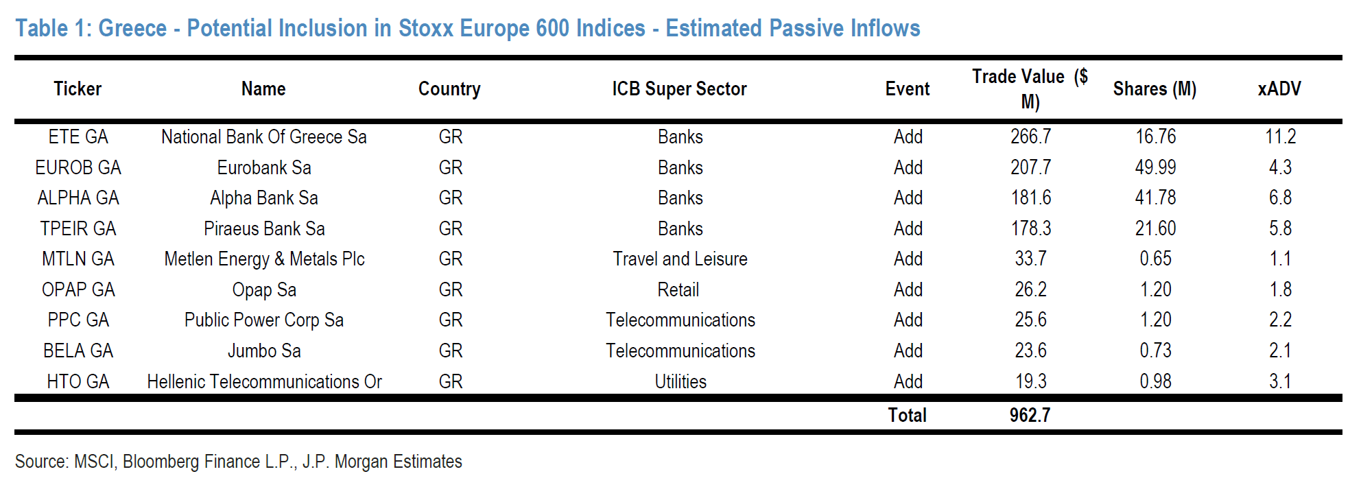 «Οι συνολικές παθητικές εισροές θα ανέλθουν σε περίπου 962,7 εκατ. δολάρια, ποσό που αντικατοπτρίζει αποκλειστικά τη μηχανική ανακατανομή κεφαλαίων», προβλέπει ο οίκος. Όπως διευκρινίζεται στο report, οι ροές αυτές συνδέονται άμεσα με την ένταξη των ελληνικών μετοχών στους δείκτες STOXX Europe 600 και Eurostoxx και δεν σχετίζονται με ενεργητικές επενδυτικές αποφάσεις ή αξιολόγηση θεμελιωδών.