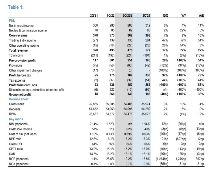 Για την Eurobank, το σύνολο των αποτελεσμάτων για το 2ο τρίμηνο ξεπέρασε την πρόβλεψή της JPM χάρη στην αύξηση των βασικών εσόδων και των εσόδων από εμπορικές συναλλαγές. Τα αποτελέσματα ωφελήθηκαν από την επιτάχυνση των νέων χορηγήσεων, τα έσοδα από προμήθειες και τα υψηλά κέρδη από συναλλαγές, ενώ η ποιότητα του ενεργητικού παρέμεινε ανθεκτική με σταθερό οργανικό σχηματισμό μη εξυπηρετούμενων ανοιγμάτων σε ετήσια βάση.