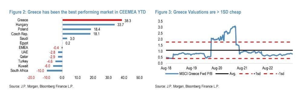 Η θέση της JPMorgan στην Ελλάδα και η προτίμηση της στις τράπεζες εκφράζεται με τη συμπερίληψη της Alpha Bank στο CEEMEA Top 10. Ο MSCI Greece διαπραγματεύεται σε ελκυστικά επίπεδα σε σχέση με τον μέσο όρο 5ετίας του, με δείκτη fwd P/E στις 6 φορές και το P/BV στις 0,7 φορές, 49% και 45% έκπτωση σε σχέση με την EM και την EMEA, αντίστοιχα. Οι χρηματοπιστωτικές επιχειρήσεις διαπραγματεύονται με τη μεγαλύτερη έκπτωση σε σχέση με τους EM/EMEA δείκτες και σε σχέση με άλλους τομείς, παρά την υψηλή διψήφια άνοδο.