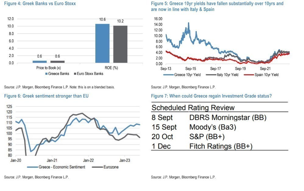 Αυτό που θα ενισχύσει περαιτέρω τις ελληνικές μετοχές είναι οι αναβαθμίσεις της αμερικανικής ανάπτυξης για το β’ εξάμηνο, οι οποίες έχουν ήδη δει τους οικονομολόγους της JPM στην ανεπτυγμένη Ευρώπη να αυξάνουν τις προβλέψεις τους για την Ευρωζώνη. Η Ελλάδα αναμένεται να αναπτυχθεί πάνω από 2%, σημαντικά πάνω από το 0,7% ανάπτυξης στην Ευρωζώνη. Μια ήπια προσγείωση της παγκόσμιας ανάπτυξης για το έτος θα πρέπει να δει τους επενδυτές να προσθέτουν στον κίνδυνο δεδομένης του ανώτερου ρυθμού ανάπτυξης της χώρας από τη στήριξη του προγράμματος ανάκαμψης και του RRF.