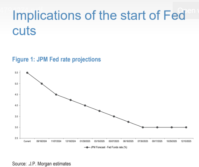 «Μετά από σωρευτικές αυξήσεις επιτοκίων ύψους 525 μ.β. (δηλαδή 5,25%) από τον Μάρτιο του 2022, η Fed πρόκειται να αρχίσει τη χαλάρωση αυτή την εβδομάδα. Οι οικονομολόγοι της JPM αναμένουν μια πρώτη κίνηση κατά 50 μ.β., ο μέσος όρος κάθε μείωσης θα είναι στις 25 μ.β. και τα futures της Fed υποδηλώνουν μείωση 37 μ.β. Για το τέλος του έτους, οι αγορές χρήματος προβλέπουν σωρευτικά 117 μ.β. περικοπές και μέχρι το τέλος του επόμενου έτους περίπου 260 μ.β.», προβλέπει ο οίκος.