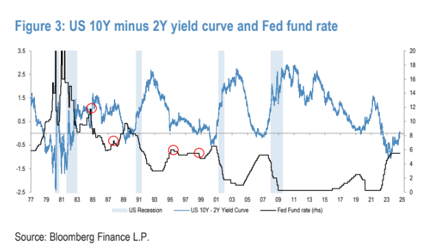 «Οι περισσότεροι από τους πρόσφατους κύκλους μείωσης των επιτοκίων είχαν κοινό χαρακτηριστικό την κίνηση προς τα κάτω των μακροπρόθεσμων αποδόσεων, καθώς και την απότομη κλίση της καμπύλης αποδόσεων. Από τα τελευταία 12 επεισόδια χαλάρωσης, τα 8 συνοδεύτηκαν από ύφεση και τα 4 από ‘ήπια προσγείωση’.