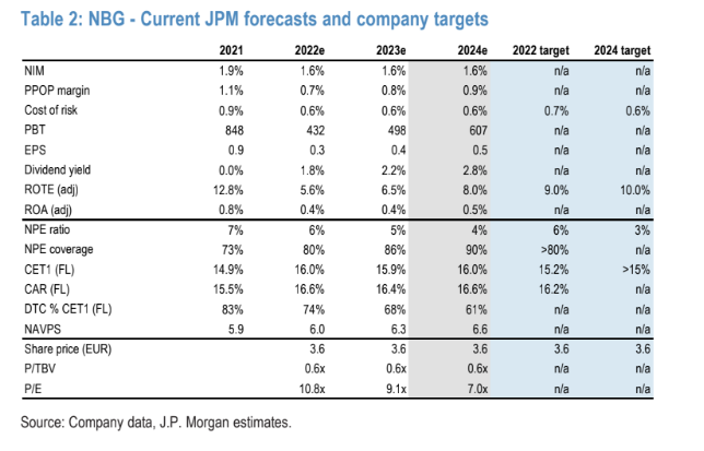 Η διοίκηση ανέφερε ανοδική πορεία για τις προβλέψεις του 2022 λόγω των προοπτικών των επιτοκίων, καθώς και της καλύτερης από τις αναμενόμενες επιδόσεις επί των προμηθειών. Οι οργανικές τάσεις για την ποιότητα του ενεργητικού φαίνονται επίσης ενθαρρυντικές, με συνεχή αρνητικό σχηματισμό και χωρίς ορατή αλλαγή στη συμπεριφορά των πελατών μέχρι στιγμής, επισημαίνει η JPM.