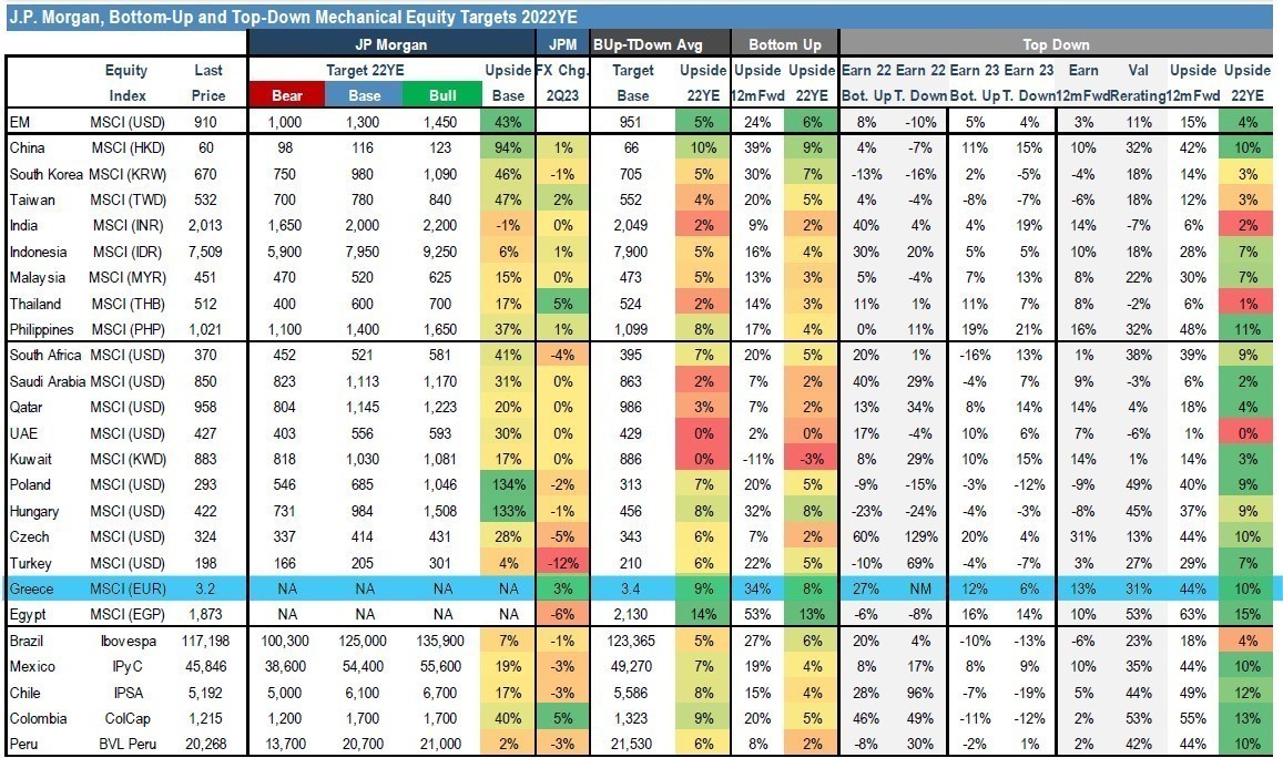 Η JP Morgan θέτει το στόχο για τον δείκτη MSCI Αναδυόμενων Αγορών για το 2022 στις 1.300 μονάδες στο βασικό της σενάριο και πολύ υψηλότερα από την τρέχουσα αποτίμηση του δείκτη. Ταυτόχρονα, παρ ότι αποφεύγει να πάρει ευθέως θέση για την τιμή στόχο του εγχώριου δείκτη MSCI, εκτιμά με δύο άλλες μεθόδους αποτίμησης ότι το ανοδικό περιθώριο για τις eλληνικές μετοχές του δείκτη MSCI Greece είναι κατά μέσο όρο 9%, ποσοστό αρκετά υψηλότερο από το μέσο όρο που εμφανίζουν οι αναδυόμενες αγορές. Παρόλα αυτά δεν προβαίνει σε κάποια σύσταση, είτε θετική είτε αρνητική. για τις εγχώριες μετοχές του δείκτη αναφοράς των ξένων διαχειριστών.