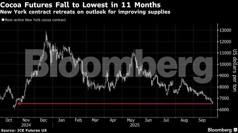 Οι τιμές των συμβολαίων μελλοντικής εκπλήρωσης κακάο υποχώρησαν στη Νέα Υόρκη στο χαμηλότερο επίπεδο των τελευταίων 11 μηνών, καθώς οι αγορές προεξοφλούν ότι οι αυξήσεις στις τιμές που λαμβάνουν οι αγρότες θα ενισχύσουν τις πωλήσεις και θα βελτιώσουν την προσφορά.
