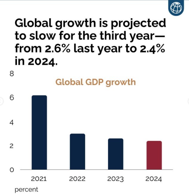 Δυσοίωνα τα μηνύματα της Παγκόσμιας Τράπεζας για την πορεία της παγκόσμιας οικονομίας και το 2024, με την νέα έκθεση της να προβλέπει επιβράδυνση των ρυθμών ανάπτυξης για τρίτη συνεχόμενη χρονιά, επιδεινώνοντας τα επίπεδα φτώχειας και τα χρέη των αναπτυσσόμενων και φτωχότερων κρατών.