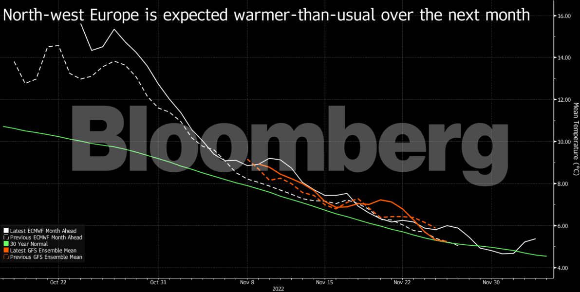 Τα συμβόλαια μελλοντικής εκπλήρωσης του ευρωπαϊκού αερίου υποχώρησαν έως και 12% και είναι περίπου 70% χαμηλότερα από τα υψηλά επίπεδα του Αυγούστου. Οι υψηλότερες από τις συνηθισμένες θερμοκρασίες αναμένεται να παραμείνουν σε ολόκληρη την Ευρώπη μέχρι το τέλος του μήνα, καθυστερώντας την έναρξη της περιόδου θέρμανσης και διευκολύνοντας τη διαδικασία πλήρωσης των αποθηκευτικών χώρων στην Ευρώπη. Οι σημαντικές εισαγωγές υγροποιημένου φυσικού αερίου συνέβαλαν στην αύξηση των αποθεμάτων σε υψηλότερα από τα συνηθισμένα επίπεδά..