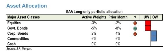 «Αυτόν τον μήνα προσαρμόζουμε το χαρτοφυλάκιο του υποδείγματός μας: 1) μειώνουμε τις θέσεις σε μετοχές (underweight σύσταση) σε γενικές γραμμές και στη ζώνη του ευρώ και περιφερειακά, δεδομένης της πρόσφατης υπεραπόδοσής τους, 2) λαμβάνοντας μερικά κέρδη στις αυξημένες θέσεις μας στα ομόλογα των εταιρειών (overweight σύσταση), δεδομένης της έντονης σύσφιξης των spreads από την αρχή του έτους και 3) αντισταθμίζουμε αυτές τις κινήσεις καλύπτοντας μέρος των μειωμένων θέσεων μας στα κρατικά ομόλογα, δεδομένου ενός ευνοϊκότερου μεσοπρόθεσμου σκηνικού.