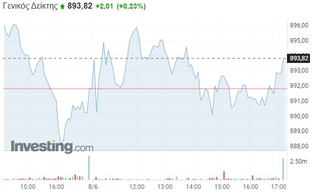 Πιο συγκεκριμένα, ο Γενικός Δείκτης κατέγραψε μικρή άνοδο κατά 0,23% και έκλεισε στις 893,82 μονάδες, κερδίζοντας μόλις δύο μονάδες σε σχέση με το κλείσιμο της Τρίτης (891,81 μονάδες). Το τόξο των ημερήσιων διακυμάνσεων διαμορφώθηκε σε έξι μονάδες (από 889,77 έως 896,01 μονάδες), με τον τζίρο των συναλλαγών να παραμένει σε χαμηλά επίπεδα, μην υπερβαίνοντας τα 62 εκατ. ευρώ (5η ημέρα με τζίρο κάτω των 70 εκατ.).