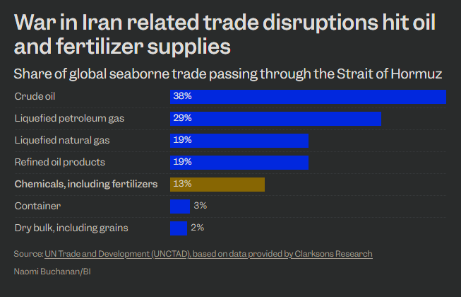Ο ΟΗΕ εκτιμά ότι περίπου το ένα τρίτο του παγκόσμιου εμπορίου λιπασμάτων δια θαλάσσης διέρχεται από τα Στενά του Ορμούζ.