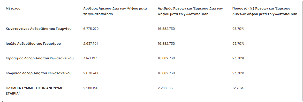 Η εταιρία «ΟΛΥΜΠΙΑ ΣΥΜΜΕΤΟΧΩΝ ΑΝΩΝΥΜΗ ΕΤΑΙΡΙΑ», ελέγχεται από κοινού και ανήκει στους κ.κ. Κωνσταντίνο Λαζαρίδη του Γεωργίου, Ιουλία Λαζαρίδου του Γερασίμου, Γεράσιμο Λαζαρίδη του Κωνσταντίνου και Γεώργιο Λαζαρίδη του Κωνσταντίνου.