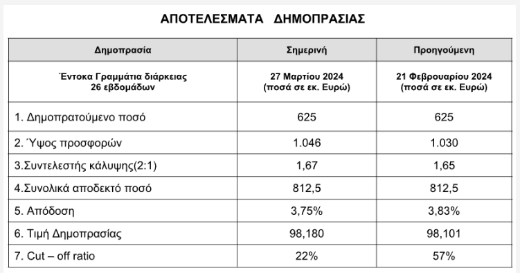 Η δημοπρασία πραγματοποιήθηκε μέσω των Βασικών Διαπραγματευτών Αγοράς (Primary Dealers), και η ημερομηνία διακανονισμού είναι η Τρίτη 2 Απριλίου 2024.