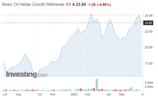 Παρά την τρέχουσα αδυναμία της μετοχής, η Motor Oil εξακολουθεί να βρίσκεται σε απόσταση αναπνοής από το ιστορικό υψηλό των 25,7 ευρώ.