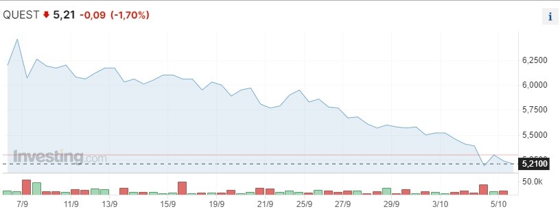 Μέσα σε αυτό το χρονικό διάστημα, η Quest Συμμετοχών έχει απολέσει σχεδόν 15%, καθώς την Πέμπτη διολισθαίνει κατά επιπλέον 1,7% και αναδιπλώνεται στα 5,21 ευρώ, δηλαδή στο χαμηλότερο επίπεδο από τον Μάρτιο του 2021.
