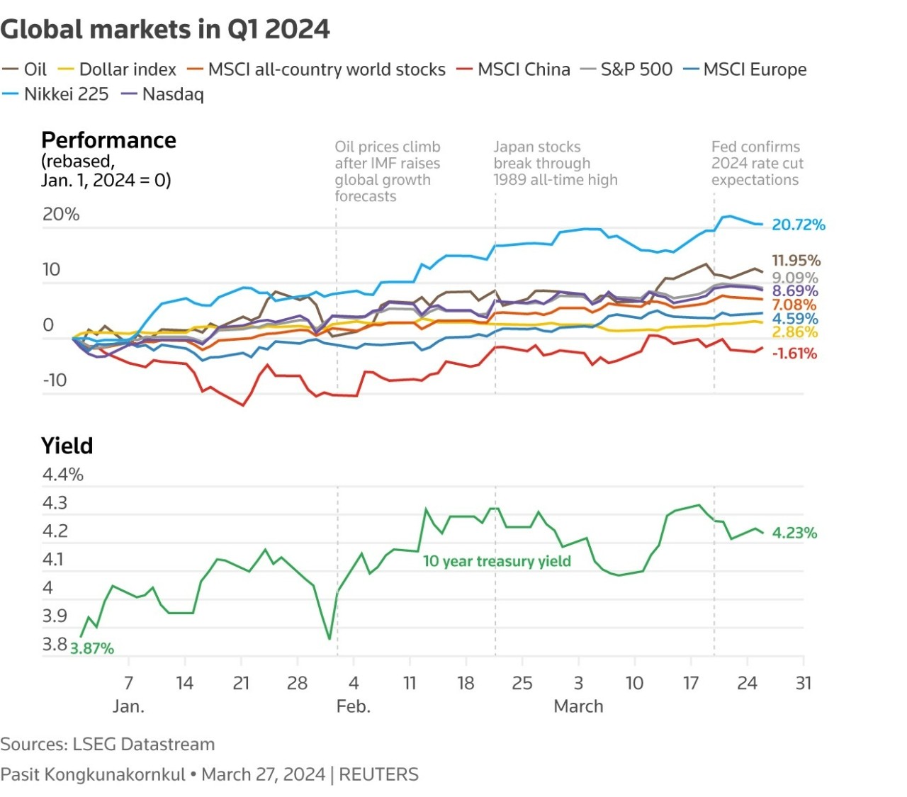 Ο παγκόσμιος δείκτης μετοχών MSCI ο οποίος πέτυχε υψηλά ρεκόρ τον Μάρτιο, έχει αυξηθεί κατά 10% από τα μέσα Ιανουαρίου, αφότου οι επενδυτές εγκατέλειψαν τα προηγούμενα στοιχήματά τους για έως και επτά μειώσεις των επιτοκίων των ΗΠΑ το 2024.
