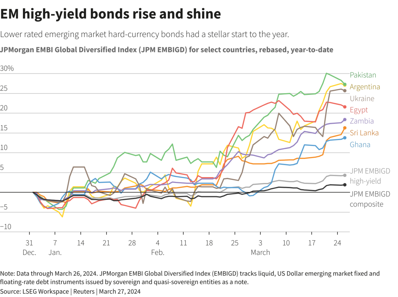 «Οι κρατικοί τίτλοι υψηλής απόδοσης των αναδυόμενων αγορών έχουν σημειώσει έντονη υπεραπόδοση από το δ’ τρίμηνο του 2023, ενισχυμένοι από την στροφή της Fed, τη χαλάρωση των συνθηκών εξωτερικής χρηματοδότησης και τη στήριξη της χρηματοδότησης από το ΔΝΤ και το GCC, καθώς η χρηματοδότηση της Κίνας έχει σταθεροποιηθεί», δήλωσε ο στρατηγικός αναλυτής της Citi, Γιόχαν Τσούα.