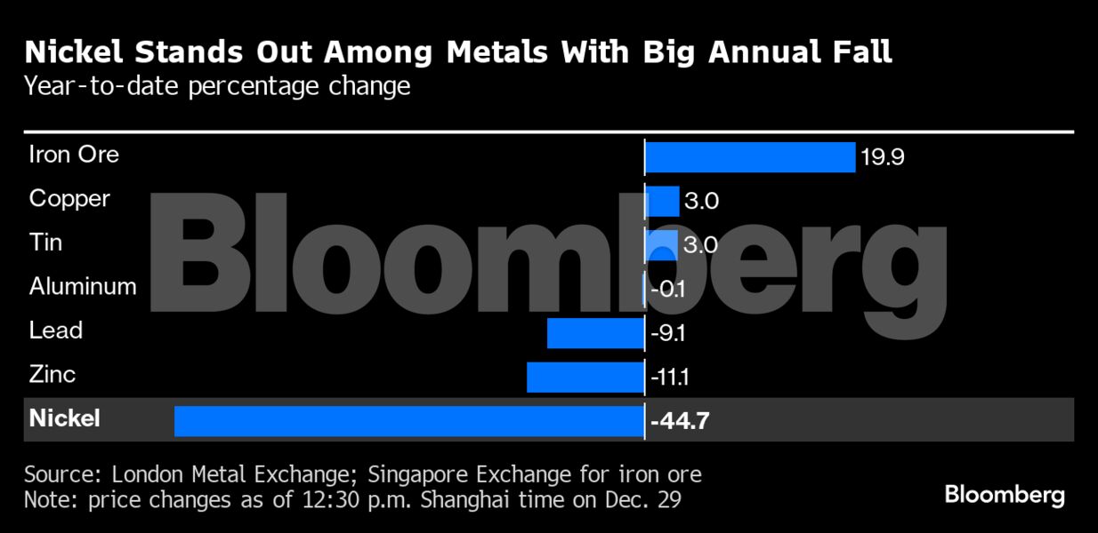 Σε μια ως επί το πλείστον υποτονική χρονιά για την αγορά μετάλλων, το νικέλιο αναδείχθηκε ως ο μεγάλος χαμένος του 2023 ενώ δεν διακρίνονται σημάδια ανάκαμσψης, τουλάχιστον όχι σήμερα.