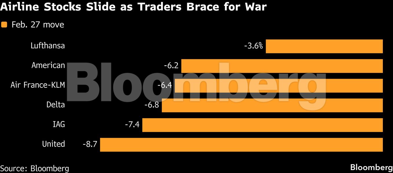 Στην Ασία, η Qantas Airways υποχώρησε έως 10%, η Japan Airlines Co. 7,1% και η Singapore Airlines Ltd. 7,5%. Οι επενδυτές παρακολουθούν επίσης τις American Airlines Group, Delta Air Lines και Deutsche Lufthansa .