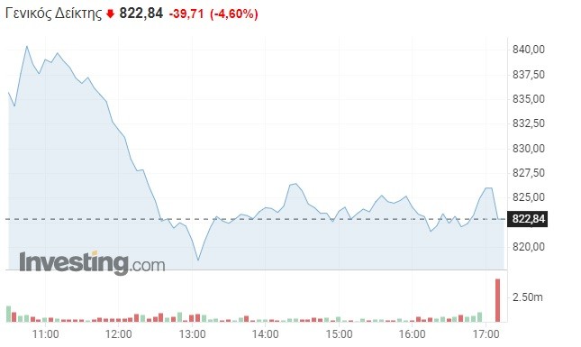 Πιο συγκεκριμένα, ο Γενικός Δείκτης βούλιαξε κατά 4,60% (δεύτερες χειρότερες απώλειες για το 2022) και οπισθοχώρησε στις 822,84 μονάδες, χάνοντας σχεδόν 40 μονάδες σε σχέση με το κλείσιμο της Παρασκευής (862,55 μονάδες). Το τόξο των ημερήσιων διακυμάνσεων διαμορφώθηκε σε 36 μονάδες (από 818,56 έως 854,05 μονάδες), με τον τζίρο των συναλλαγών να υπερβαίνει τα 115 εκατομμύρια ευρώ.