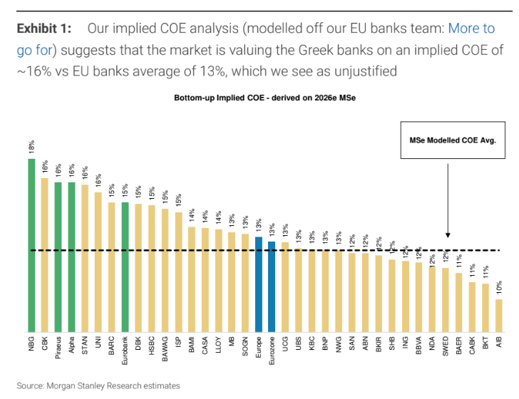 Τα στοιχεία της Μorgan Stanley αναδεικνύουν ότι οι μετοχές των ελληνικών τραπεζών στο ταμπλό του ΧΑ ενέχουν σημαντικό discount έναντι των ευρωπαϊκών τραπεζών, καθώς το κόστος κεφαλαίου που ενσωματώνουν οι τραπεζικές μετοχές (implied Cost of Equitiy – COE) στις τρέχουσες τιμές τους αποτιμήσεις είναι στα επίπεδα του 16% περίπου, ενώ οι ευρωπαϊκές τράπεζες είναι διαπραγματεύσιμες με 13% περίπου. Το κόστος κεφαλαίου που ενσωματώνει η Morgan Stanley σα στα υποδείγματα αποτίμησης των ελληνικών τραπεζών είναι στο 14%. Ο οίκος εκτιμά ότι το τεκμαρτό κόστος κεφαλαίου που η αγορά ενσωματώνει στις τραπεζικές μετοχές σε σχέση με τις ευρωπαϊκές τράπεζες είναι αδικαιολόγητο.