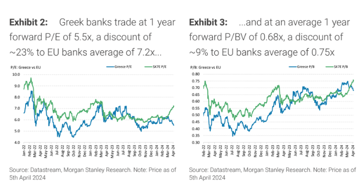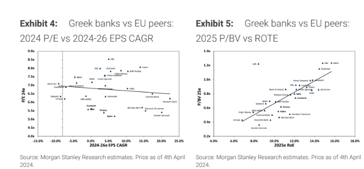 Ο οίκος επισημαίνει ότι οι ελληνικές μετοχές είναι διαπραγματεύσιμες, σε μέσα επίπεδα, σε 5,5 φορές περίπου για τον δείκτη P/E έναντι 7,2 φορές περίπου για τις ευρωπαϊκές. Ο μέσος ετησιοποιημένος ρυθμό αύξησης των κερδών ανά μετοχή των εγχώριων τραπεζών για το 2024-2026 είναι στο 4% περίπου έναντι 6% περίπου για τις ευρωπαϊκές τράπεζες της ΕΕ κατά μέσο όρο. Η σύγκριση μεταξύ των ελληνικών και των ευρωπαϊκών τραπεζών δείχνει ότι υπάρχουν ευκαιρίες για περαιτέρω re-rating στις ελληνικές μετοχές και το δικαιολογείται από τις υψηλές αποδόσεις στον δείκτη RoTE τη διετία 2025-2026, παρά την υψηλή ευαισθησία στα επιτόκια.