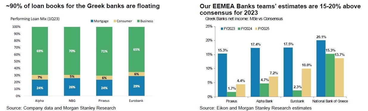 Οι overweight επιλογές για την περιοχή ΕΜΕΑ είναι τα ΗΑΕ, η Ελλάδα και η Πολωνία, ενώ οι underweight επιλογές μας είναι το Κουβέιτ, το Κατάρ και η Αίγυπτος. Οι τράπεζες αποτελούν το 39% του δείκτη MSCI Greece, ενώ οι αμυντικές καταναλωτικές επιχειρήσεις και οι τηλεπικοινωνίες αποτελούν το 31%. Οι ελληνικές τράπεζες έχουν σημειώσει σημαντική μείωση των NPEs, με όλες τις τράπεζες να επιτυγχάνουν μονοψήφιο δείκτη NPEs αλλά και το 90% περίπου των δανείων των ελληνικών τραπεζών να είναι κυμαινόμενα. Οι εκτιμήσεις των ομάδων της MS για τις τράπεζες EEMEA είναι 15-20% πάνω από το consensus για το 2023.
