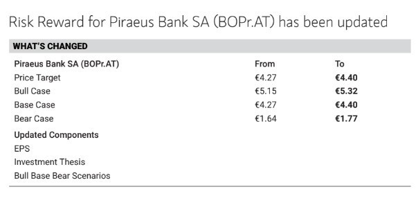 Η Morgan Stanley, μετά τα αποτελέσματα του β’ τριμήνου, προχώρησε σε αναβάθμιση των εκτιμήσεων της της και των προβλέψεων της για τις επιδόσεις της τράπεζας, τη σχέση απόδοσης και κινδύνου λόγω των φθηνών αποτιμήσεων, αυξάνοντας την τιμή στόχο στα 4,40 ευρώ, ενώ διατηρείται η σύσταση υπεραπόδοσης (overweight).