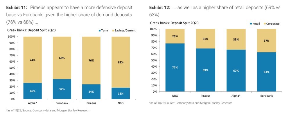 Η εξέλιξη του κόστους χρηματοδότησης μέσω της στροφής προς τις προθεσμιακές καταθέσεις θα αποτελέσει το βασικό στοιχείο κερδών για το μέλλον. Η Τράπεζα Πειραιώς φαίνεται να έχει μια πιο αμυντική καταθετική βάση σε σύγκριση με τη Eurobank και επιπλέον, η Morgan Stanley βλέπει θετικές προοπτικές για τα δάνεια και την ανάπτυξη, το περιβάλλον των υψηλότερων επιτοκίων και τις προσπάθειες περιορισμού του κόστους που οδηγούν σε καλύτερο δείκτη αποδοτικότητας ενσώματων ιδίων κεφαλαίων RοTE για το 2025. Για τα υψηλότερα επιτόκια, προβλέπει ανθεκτικό ενεργητικό σε όρους ποιότητας με κόστος κινδύνου στις 70 μ.β. το 2024-2025 και σταθερή αύξηση των δανείων για το 2023-2025 στο 5% με 7%. Οι βασικοί κίνδυνοι αφορούν την ανάκαμψη του μακροοικονομικού περιβάλλοντος που είναι ευάλωτη σε εξωτερικούς κλυδωνισμούς και την απορρόφηση των κονδυλίων της ΕΕ που είναι ασθενέστερη του αναμενόμενου.