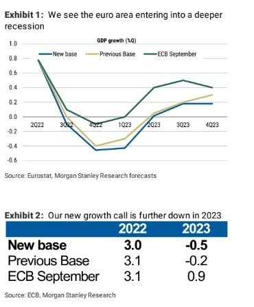 «Πιστεύουμε ότι το ΑΕΠ θα μειωθεί για τρία συνεχόμενα τρίμηνα, ελαφρώς το γ’ τρίμηνο του 2022 σε -0,1% (σε τριμηνιαία βάση) και περισσότερο το δ’ τρίμηνο στο -0,5% (σε τριμηνιαία βάση) και το α’ τρίμηνο του 2023 κατά -0,4% (σε τριμηνιαία βάση)», διευκρινίζει η Morgan Stanley. Η ανάκαμψη είναι πιθανό να είναι βραδύτερη από ότι συνήθως, καθότι ο υψηλός πληθωρισμός θα συνεχίσει να έχει αντίκτυπο στις ιδιωτικές δαπάνες. Η ύφεση που προβλέπει για το 2023 θα οδηγηθεί πιθανότατα, κυρίως από την εγχώρια ζήτηση, με την κατανάλωση των νοικοκυριών και τις ιδιωτικές επενδύσεις να αναμένεται να σημειώσουν απότομη πτώση. Ο αμερικανικός οίκος σημειώνει επίσης την ιδιαίτερη αβεβαιότητα γύρω από τις προοπτικές, καθώς, σε ένα σενάριο “αρκούδας”, τα ζητήματα ενεργειακού εφοδιασμού θα μπορούσαν να διαταράξουν σημαντικά τις αλυσίδες παραγωγής, οδηγώντας σε μια πιο σοβαρή ύφεση.