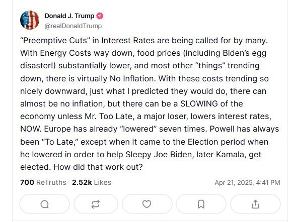 «Οι “Προληπτικές Μειώσεις” στα επιτόκια είναι απαραίτητες και τις ζητούν πολλοί», έγραψε, ασκώντας νέα πίεση στην Fed. Η τοποθέτηση έρχεται σε μια στιγμή που η Αγορά ήδη κλυδωνίζεται από φήμες περί αποπομπής του Πάουελ και την έντονη παρέμβαση του Προέδρου στα εσωτερικά της κεντρικής τράπεζας.