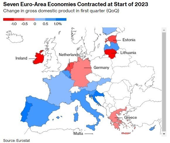 Όσον αφορά το ΑΕΠ, η οικονομία της Ευρωζώνης συρρικνώθηκε κατά 0,1% στο α’ τρίμηνο (σε τριμηνιαία βάση), συμπληρώνοντας το δεύτερο διαδοχικό τρίμηνο αρνητικής μεταβολής και κρούοντας τον κώδωνα του κινδύνου για τις επιπτώσεις των υψηλών επιτοκίων.