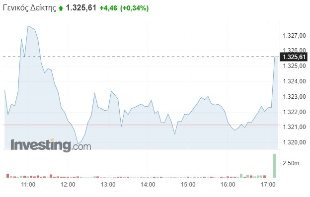 Πιο αναλυτικά, ο Γενικός Δείκτης σημείωσε μικρή άνοδο κατά 0,34% και διαμορφώθηκε στις 1.325,61 μονάδες, κερδίζοντας 4,5 μονάδες σε σχέση με το κλείσιμο της Πέμπτης (1.321,15 μονάδες). Το τόξο των ημερήσιων διακυμάνσεων καθορίστηκε σε οκτώ μονάδες (από 1.319,46 έως 1.327,87 μονάδες), με τον τζίρο των συναλλαγών να κυμαίνεται στα 87,2 εκατ. ευρώ.