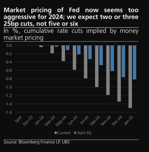 Γι αυτόν το λόγο, οι αγορές άρχισαν να εκτιμούν μείωση των επιτοκίων 150 μονάδων βάσης το 2024, με πιθανό σημείο έναρξης τον ερχόμενο Μάρτιο. Όπως αναφέρει ανάλυση της UBS, οι εκτιμήσεις της αμερικανικής αγοράς είναι υπερβολικά επιθετικές σε σχέση με τα πρόσφατα και επικαιροποιημένα οικονομικά στοιχεία.