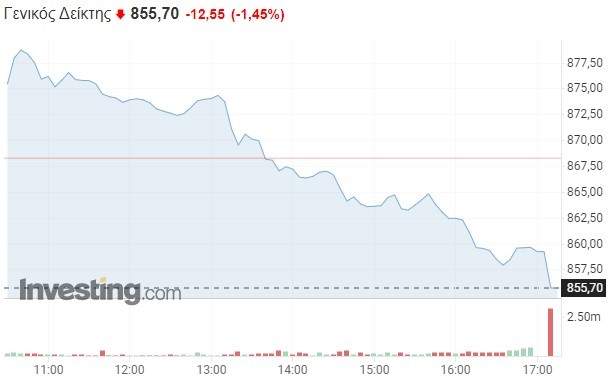 Πιο συγκεκριμένα, ο Γενικός Δείκτης σημείωσε αξιοσημείωτη πτώση κατά 1,44% και διαμορφώθηκε στις 855,70 μονάδες, χάνοντας περισσότερες από 12,5 μονάδες σε σχέση με το κλείσιμο της Δευτέρας (868,25 μονάδες), αλλά και 24 μονάδες σε σχέση με το υψηλό ημέρας. Το τόξο των ημερήσιων διακυμάνσεων καθορίστηκε σε -επίσης- 24 μονάδες (από 855,70 έως 879,26 μονάδες), με τον τζίρο των συναλλαγών να κυμαίνεται κοντά στα 53 εκατ. ευρώ.