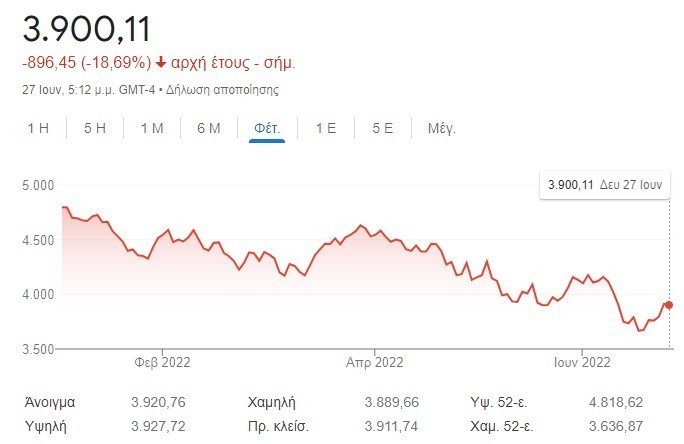 Ας σημειωθεί ότι τη Δευτέρα ο S&P 500 έκλεισε στις 3.900 μονάδες, έχοντας καταγράψει απώλειες της τάξης του 18% από τις αρχές του έτους, στο χειρότερο α’ εξάμηνο από το 1970 και την προεδρία του Ρόναλντ Ρίγκαν.